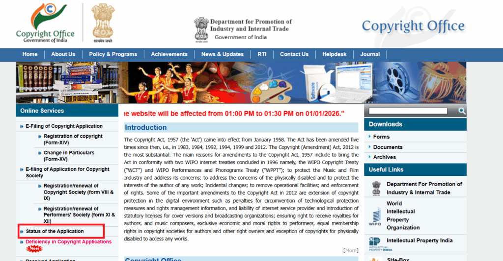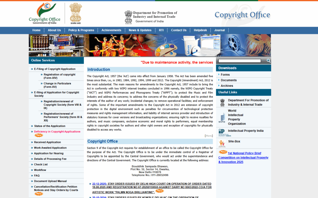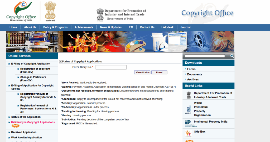 In India, copyright applications and records are maintained by the Copyright Office of India under the Department for Promotion of Industry and Internal Trade. The system allows applicants to track progress online, but only if they actively check.